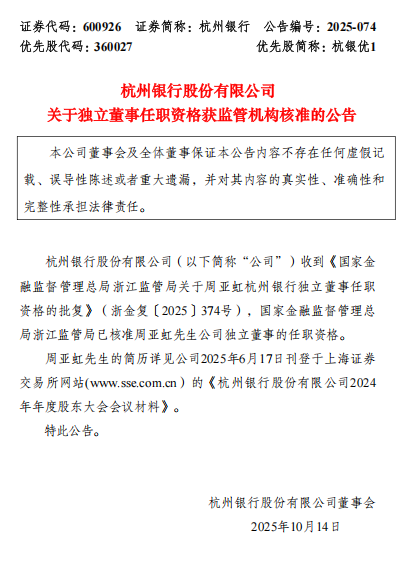 10月13日,杭州银行股份有限公司发布关于独立董事任职资格获监管机构核准的公告,国家金融监督管理总局浙江监管局已核准周亚虹先生公司独立董事的任职资格。