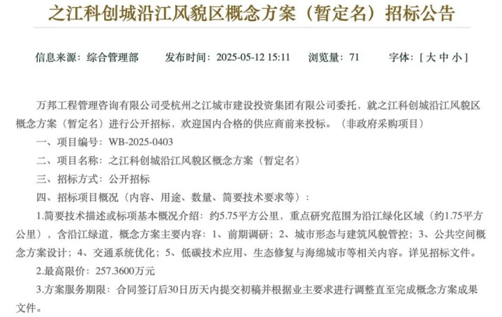 在这份招标公告中,之江科创城沿江风貌区约5.75平方公里,其中重点区域为沿江绿化区域,约1.75平方公里。